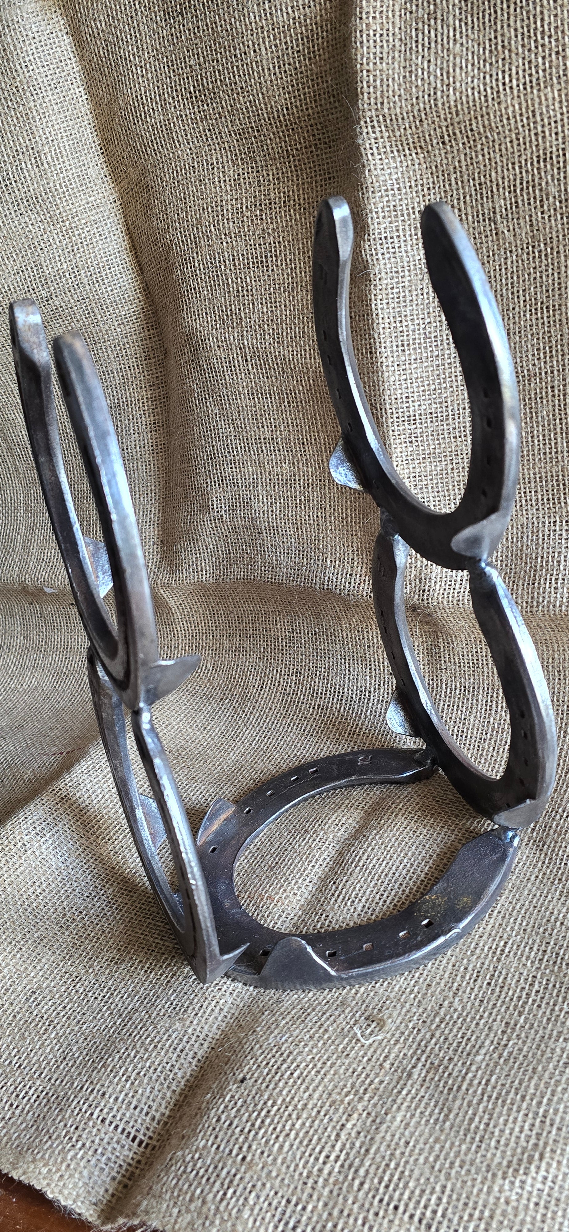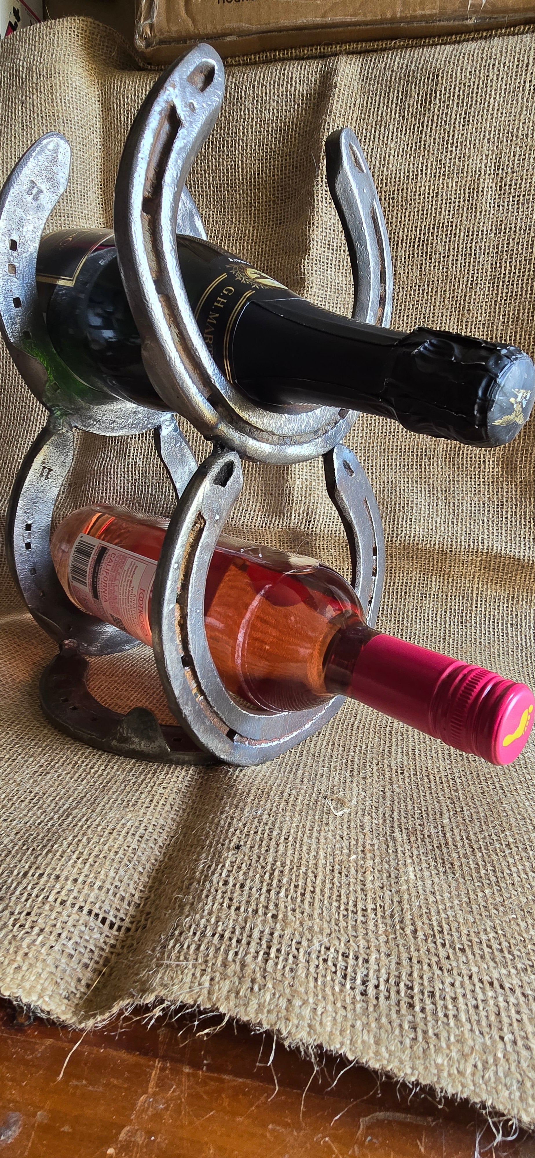 Crafted from quality, locally sourced reclaimed horseshoes, our Two-Tier Wine Rack brings a touch of rustic charm to any home. This unique piece isn’t just a conversation starter—it’s a practical way to display your favorite wines with style. The sturdy, handcrafted design holds up to 2 bottles securely, while the natural patina of the horseshoes adds character and warmth to your space.